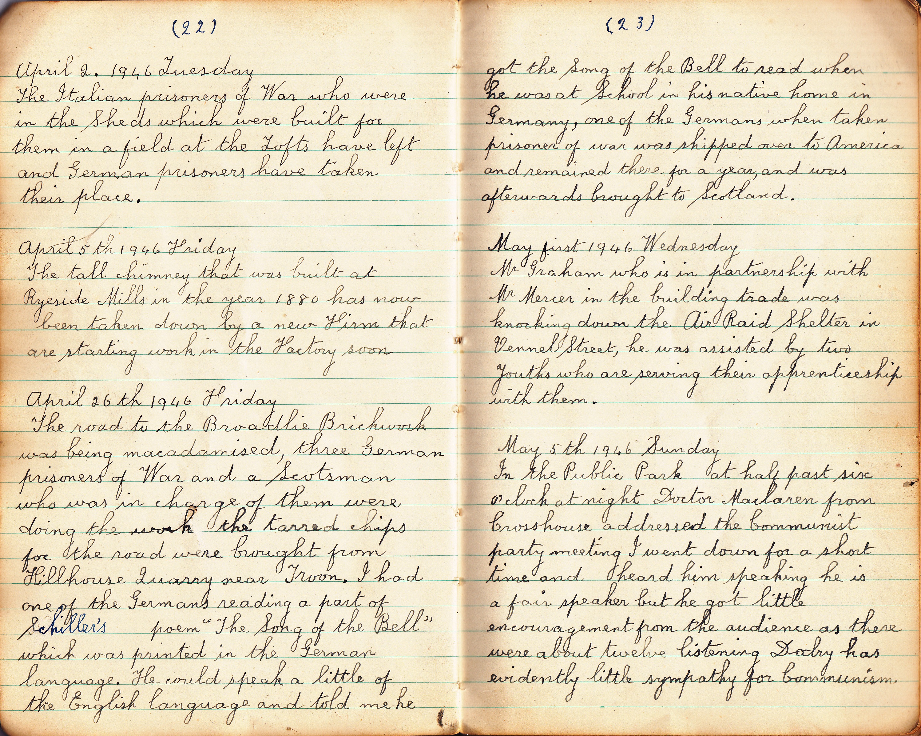 A number of ex soldiers arrived at the huts which were built for the prisoners of war. The school had a half day holiday as this was the Headmaster Mr Pratt's last day at school, he is now retired from his profession.