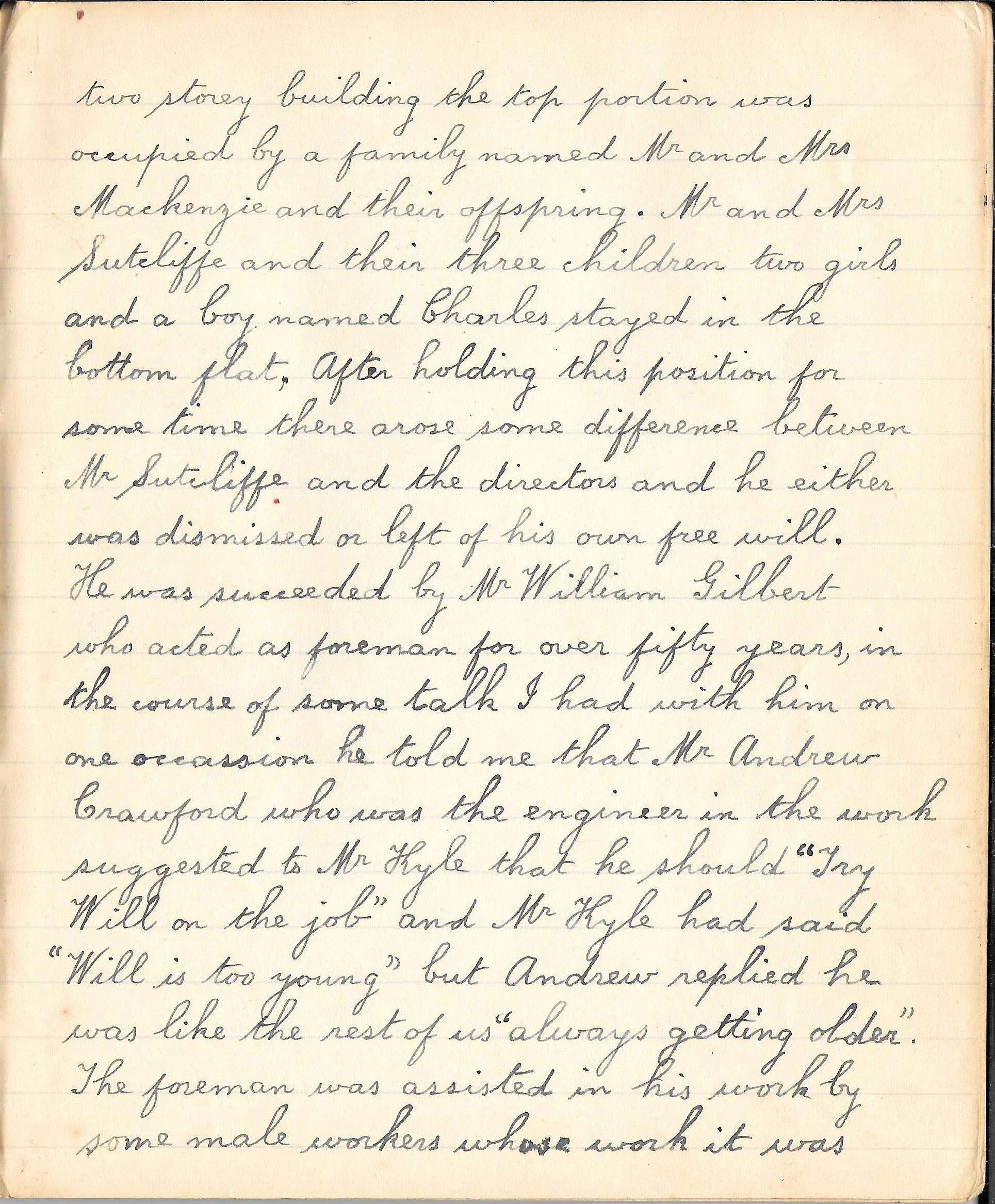 The house in James Street named Northfield when built was bought by Mr Henry Watson for £900. When he and his wife died the members of their family sold it to Mr William Wilson school teacher for £600. Mr Wilson in this year has sold it to the Co-operative Society for over £2000, it is now occupied by the new manager of the Co-operative Society, his name is Mr Leadbetter.